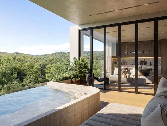 The interiors are graced with full windows that frame stunning vistas of the Uluwatu jungle, opening onto a generous terrace with a private pool. Inside, every detail is meticulously crafted.