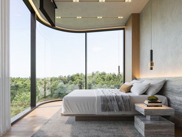 A key highlight of this unit is the stunning panoramic view it offers over the lush Uluwatu jungle. The master bedroom, a showcase of architectural ingenuity, features corner windows that grant a 270-degree view, immersing you in the breathtaking scenery.